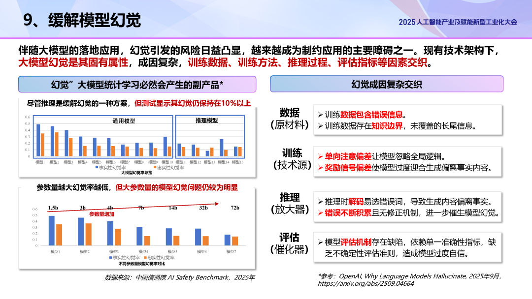 伴随大模型的落地应用,幻觉引发的风险日益凸显,越来越成为制约应用的主要障碍之一。根据OpenAI理论研究,幻觉是一种在LLM统计学习本质下必然会产生的、可预测的副产品。根据中国信通院“AI Safety Benchmark”大模型幻觉测试结果,幻觉问题难以得到根治:尽管推理模型被认为是缓解幻觉的一种方案,但所测推理模型的幻觉率依然维持在10%以上。此外,大模型幻觉也存在类似“Scaling Law”的规律:基本呈现大模型参数量越高,幻觉率越低的情况。但大参数量的模型幻觉问题仍较为明显,72b参数模型幻觉依然超过14%。在现有技术架构下,大模型幻觉是其固有属性,成因复杂,训练数据、训练方法、推理过程、评估指标等因素交织。