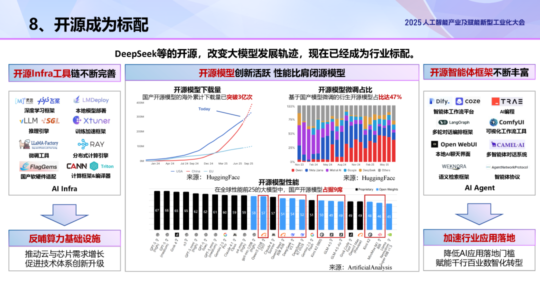 2025年,DeepSeek的开源某种程度上改变了大模型的发展轨迹。开源不仅孕育出一批高质量的人工智能项目,还有力促进了上下游产业链的协同与融合,深刻改变了人工智能产业的发展格局。开源模型性能比肩闭源。以深度求索、通义千问等为代表的国产开源模型迅速崛起,为用户带来更具性价比的选择。模型性能方面,目前全球性能前25的大模型中,我国开源模型占据9席。模型普及方面,国产开源模型在Huggingface上的全球累计下载量已突破3亿次。应用生态方面,在Huggingface上基于我国开源模型的微调模型占比从2024年初的10%大幅上升至2025年7月的45%,显示出国产开源模型在国际范围内的接受度和影响力正快速提升。