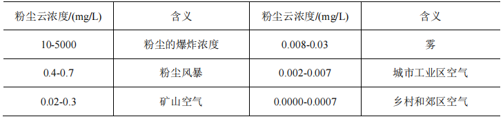 粉尘爆炸除了需要满足火三角的三个要素,即燃料、氧化剂、引燃源,同时也需要满足粉尘与空气混合成粉尘云,以及在有限空间内。因此,粉尘爆炸需要满足五个条件才能发生。这其中也牵扯到了粉尘爆炸的极限和点火能。粉尘浓度一般采出质量浓度来表示,即单位体积内粉尘的质量,单位为g/m3或mg/L。下表列出几种类型的浓度。