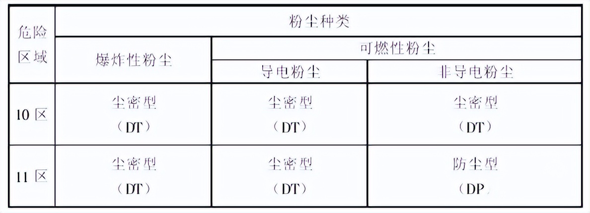 爆炸性粉尘环境电气设备防爆类型,应按下表中的规定进行选型。