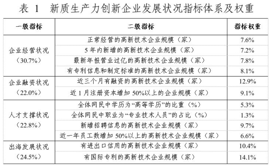 在此基础上,本研究以“企业经营—融资能力—人才基础—全球化能力”四大维度为主要指标,构建新质生产力创新企业发展状况指标体系。并通过给指标赋权,构建新质生产力创新企业发展状况综合评价指数体系(本研究采用熵权法确定指标权重),通过定量与定性结合的方法,从不同角度展开交叉分析。