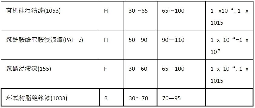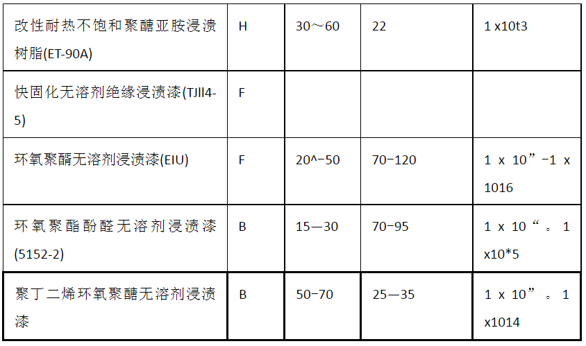 不管是有溶剂绝缘漆还是无溶剂绝缘漆,都有很多品种可供使用,人们可以根据自己的具体情况选择合适的品种。某些常用浸渍用绝缘漆的主要特性如表2所示。