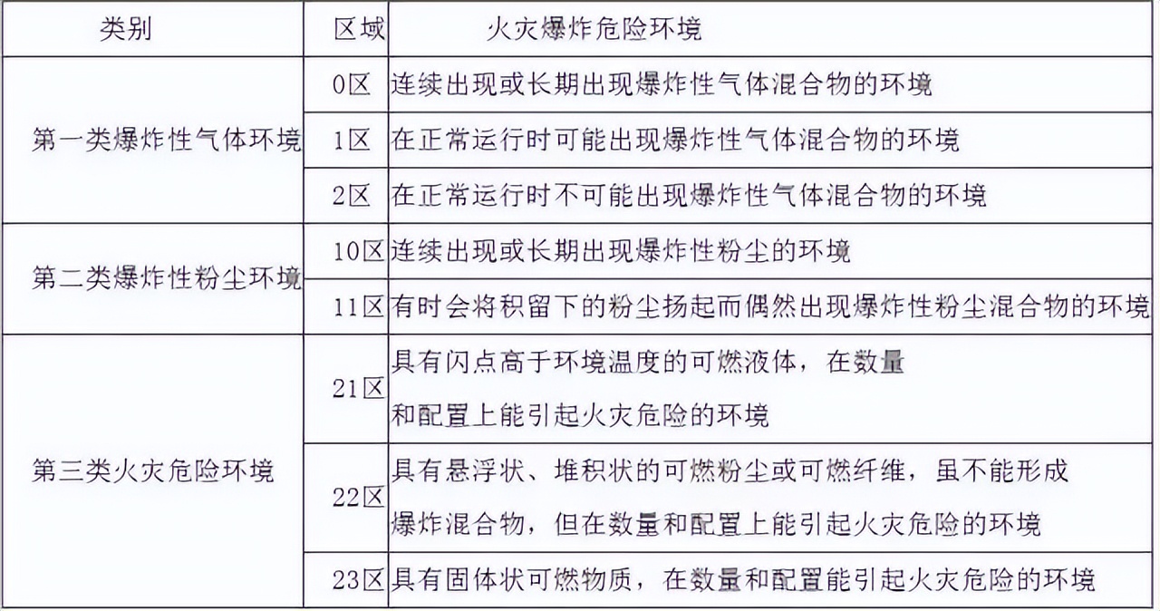 在这种情况下,就存在危险性大的场所和危险性小的场所。因此,就有必要对这些危险场所进行的“场所分类”。按照场所中气体环境出现的频率和存在的时间的长短,将场所的危险程度分类,以便按照危险区域类型采用不同的防爆措施。