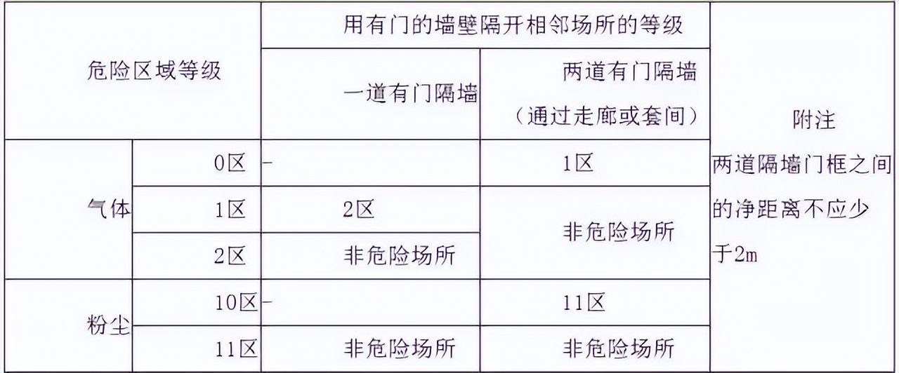 与爆炸危险区域相邻厂房之间的隔墙应是密实坚固的非燃性实体,隔墙上的门应由坚固的非燃性材料制成,且有密封措施和自动关闭装置,其相邻厂房等级划分见下表。