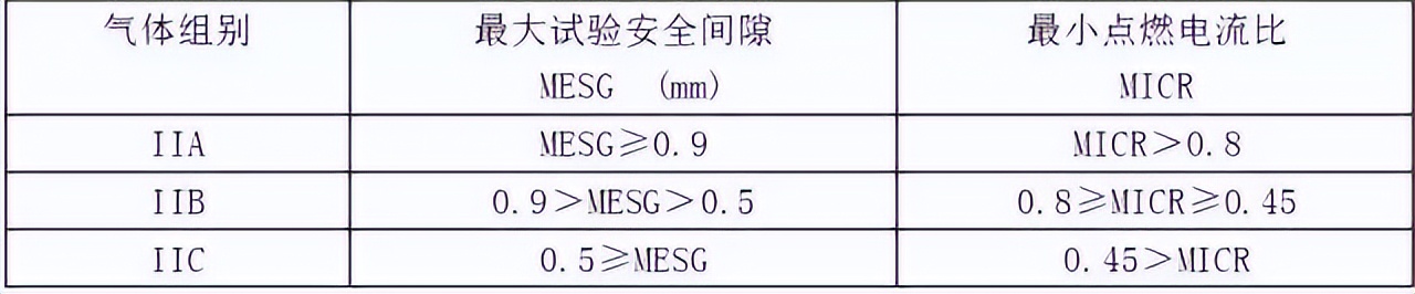 爆炸性气体混合物的传爆能力,标志着其爆炸危险程度的高低,爆炸性混合物的传爆能力越大,其危险性越高。爆炸性混合物的传爆能力可用最大试验安全间隙表示。同时,爆炸性气体、液体蒸气、薄雾被点燃的难易程度也标志着其爆炸危险程度的高低,它用最小点燃电流比表示。II类隔爆型电气设备或本质安全型电气设备,按其适用于爆炸性气体混合物的最大试验安全间隙或最小点燃电流比,进一步分为IIA、IIB和IIC类。如表所示。