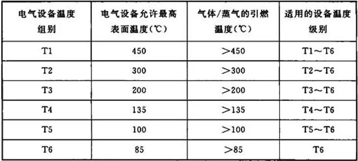 爆炸性气体混合物的引燃温度是能被点燃的温度极限值。电气设备按其最高表面温度分为T1~T6组,使得对应的T1~T6组的电气设备的最高表面温度不能超过对应的温度组别的允许值。温度组别、设备表面温度和可燃性气体或蒸气的引燃温度之间的关系如表所示。