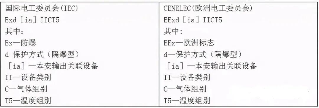 如电气设备为II类隔爆型,气体组别为B组,温度组别为T3,则防爆标志为:ExdIIBT3。如电气设备为II类本质安全型ia,气体组别为A组,温度组别为T5,则防爆标志为:ExiaIIAT5。