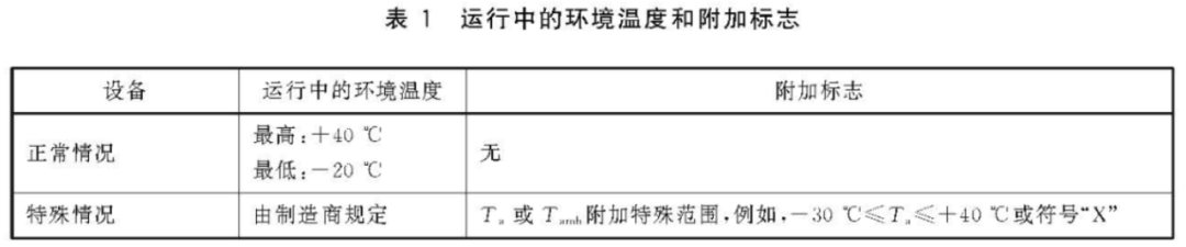 通常情况下,设备使用的环境温度应为-20℃~+40 °C,此时不需要附加环境温度标志。但当设备预计使用在不同于以上环境温度范围时视为特殊情况,标志应包括符号Ta或Tamb及上限和下限环境温度,如果不可行,符号“X”应指明包括上限和下限环境温度的特殊使用条件。见29.3e)和表1 。