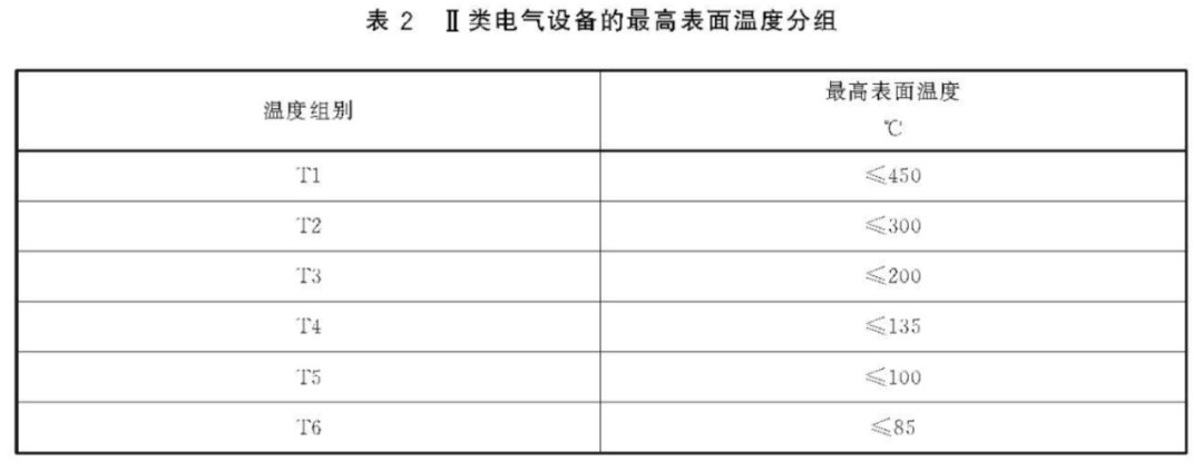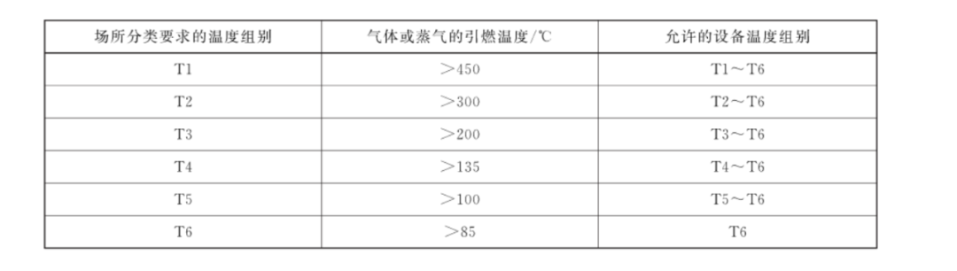 通常情况下,如果防爆电气设备的标志中没有标示环境温度范围,则防爆电气设备设计使用的环境温度为-20℃~+40℃。即防爆电气设备使用的环境温度在-20℃~+40℃范围内时,可按上表的规定选择防爆电气设备的温度组别。