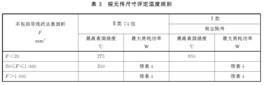 c)对于T5组,表面积(不包括导线)小于1 000 mm²的元件的表面温度不应超过150℃。