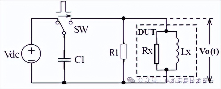 电机绕组的匝间绝缘耐压试验一般采用匝间测试仪进行测试,匝间测试高压脉冲输出电路图如图1所示。匝间测试仪可产生一定频率的高压脉冲,采用“脉冲波形比较法”检验绕组绝缘的对称平衡情况,因施加的高压脉冲波形,时间短,能量小,通常认定为“无损试验”。