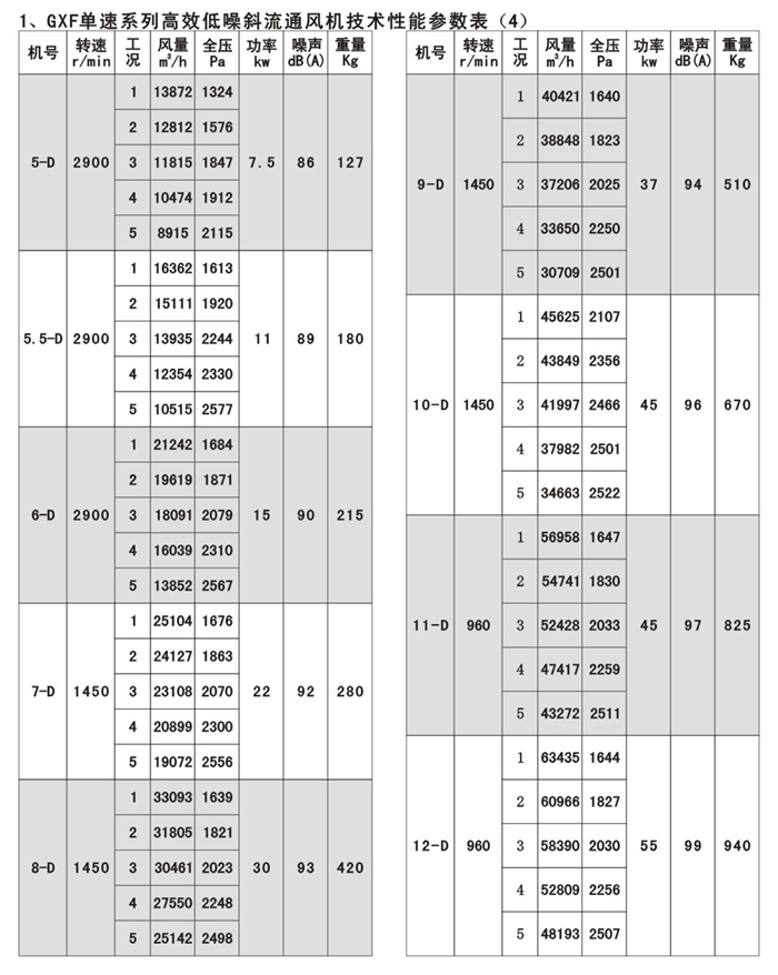 GXF系列斜流通风机按叶轮直径分为400-1400mm十四规格,按类型分为A、B、C、D、S五种类型,共五十八个机号。风量由3000-90000m3/h,全压由185-2500Pa;这样就给设计部门和用户单位提供了充分的选择条件,具体数据请查风机性能参数表。