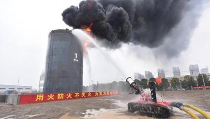 别看消防机器人块头不大,身高不足一米,身长不过一米八,一进火场便大显身手。在距离火源不到10米的近距离“战斗位置”,只见五股近百米的高压水柱从消防机器人中喷涌而出,直喷火场中央,其喷射流量之大可达手持消防水管的8-10倍,有如五条巨龙在空中舞动。与此同时,一个泡沫灭火机器人灵活进入罐体火源核心区域,以高发泡沫量扑救罐体流淌型火势。很快,熊熊燃烧的明火逐渐淡去。