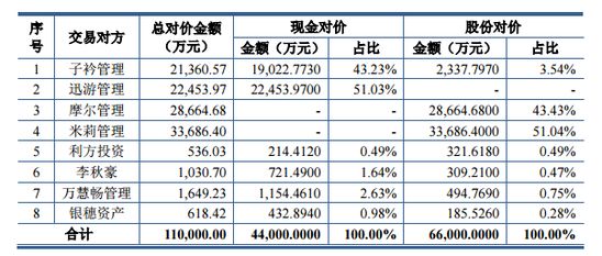 公告显示,上市公司截至本预案签署日的总股本为8320万股,按照本次交易方案,公司拟向子衿管理、迅游管理、摩尔管理、米莉管理、利方投资、李秋豪、万慧畅管理、银穗资产发行普通股16,034,985股并支付现金购买萨拉摩尔的100.00% 股权。