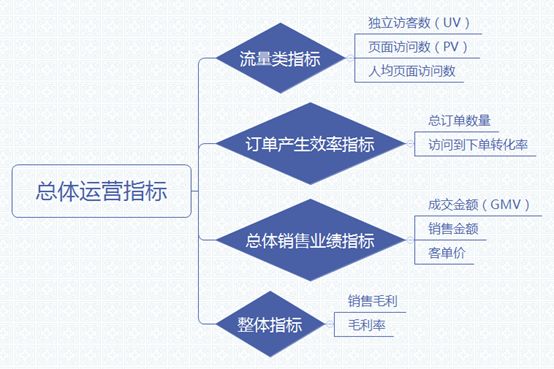 电商总体运营整体指标主要面向的人群电商运营的高层,通过总体运营指标评估电商运营的整体效果。电商总体运营整体指标包括四方面的指标: