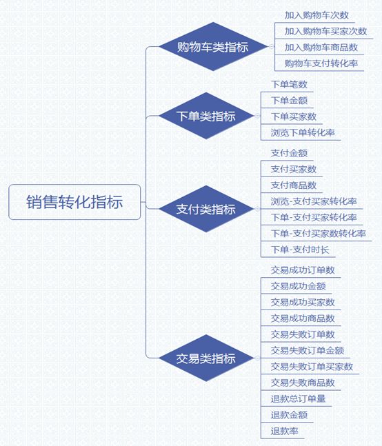 转化类指标:包括浏览-支付买家转化率(支付买家数/网站访客数)、下单-支付金额转化率(支付金额/下单金额)、下单-支付买家数转化率(支付买家数/下单买家数)和下单-支付时长(下单时间到支付时间的差值)。