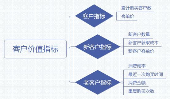 老客户指标:常见老客户指标包括消费频率、近一次购买时间、消费金额和重复购买率。消费频率是指客户在一定期间内所购买的次数;近一次购买时间表示客户近一次购买的时间离现在有多远;客户消费金额指客户在近一段时间内购买的金额。消费频率越高,近一次购买时间离现在越近,消费金额越高的客户越有价值。重复购买率则指消费者对该品牌产品或者服务的重复购买次数,重复购买率越多,则反应出消费者对品牌的忠诚度就越高,反之则越低。重复购买率可以按两种口径来统计:第一种,从客户数角度,重复购买率指在一定周期内下单次数在两次及两次以上的人数与总下单人数之比,如在一个月内,有100个客户成交,其中有20个是购买两次及以上,则重复购买率为20%;第二种,按交易计算,即重复购买交易次数与总交易次数的比值,如某月内,一共产生了100笔交易,其中有20个人有了二次购买,这20人中的10个人又有了三次购买,则重复购买次数为30次,重复购买率为30%。
