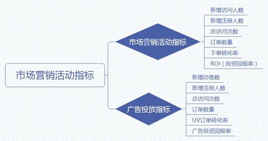 市场营销活动指标:包括新增访问人数、新增注册人数、总访问次数、订单数量、下单转化率以及ROI。其中,下单转化率是指活动期间,某活动所带来的下单的次数与访问该活动的次数之比。投资回报率(ROI)是指,某一活动期间,产生的交易金额与活动投放成本金额的比值。