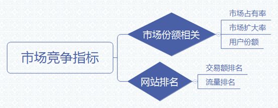 市场份额相关指标:包括市场占有率、市场扩大率和用户份额。市场占有率指电商网站交易额占同期所有同类型电商网站整体交易额的比重;市场扩大率指购物网站占有率较上一个统计周期增长的百分比;用户份额指购物网站独立访问用户数占同期所有B2C购物网站合计独立访问用户数的比例。