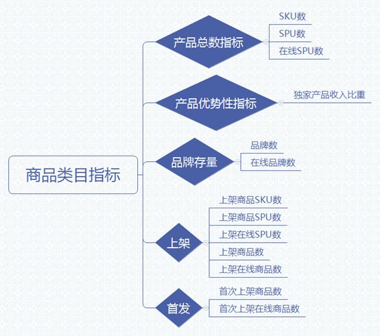 产品总数指标:包括SKU、SPU和在线SPU。SKU是物理上不可分割的小存货单位。SPU即Standard Product Unit (标准化产品单元),SPU是商品信息聚合的小单位,是一组可复用、易检索的标准化信息的集合,该集合描述了一个产品的特性。通俗点讲,属性值、特性相同的商品就可以称为一个SPU。如iphone5S是一个SPU,而iPhone 5S配置为16G版、4G手机、颜色为金色、网络类型为TD-LTE/TD-SCDMA/WCDMA/GSM则是一个SKU。在线SPU则是在线商品的SPU数。