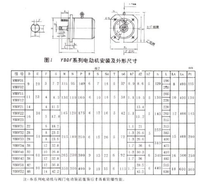 YBDF2电动机与阀门电动装置组装后的防爆性能及其派生系列的防爆性能符合GB3836.2《爆炸性环境用防爆电气设备 隔爆型电气设备“d”》的规定,也符合IEC79—1的规定,制成隔爆型,防爆标志为dⅡBT4,适用于工厂Ⅱ类A、B级,温度组别为T1~T4组的可燃性气体或蒸气与空气形成的爆炸性混合物的场所(根据订货要求,防爆标志也可制成d I,适用于含有甲烷或煤尘爆炸性混合物的煤矿井下场所)。